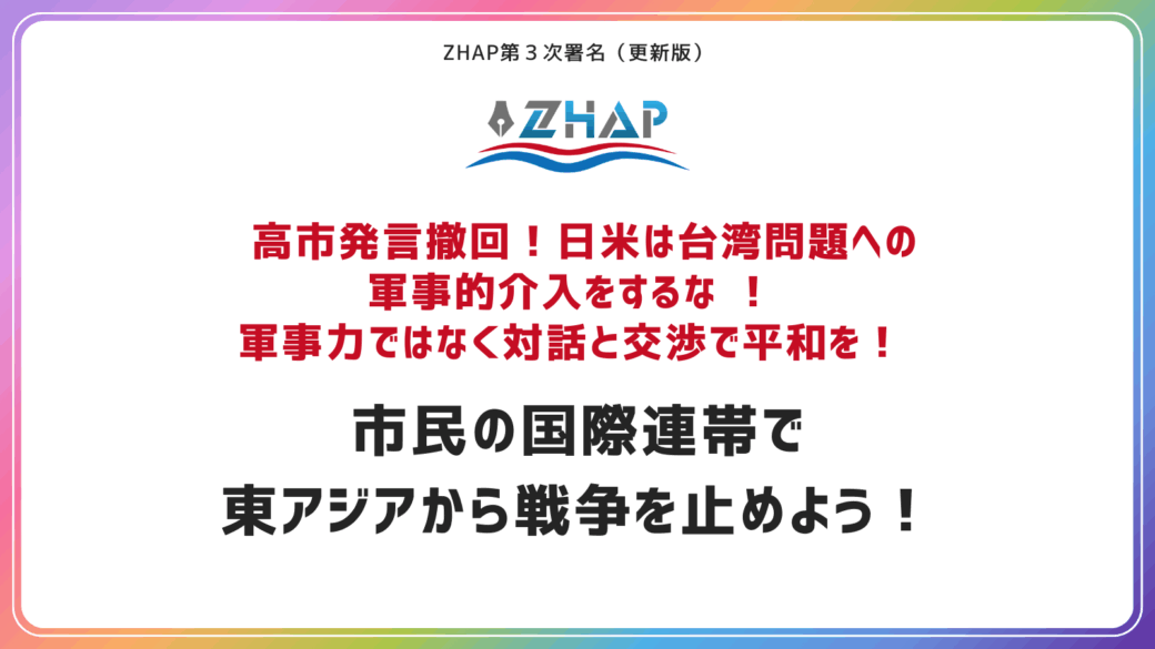 高市発言撤回!日米は台湾問題への軍事的介入をするな! 軍事力ではなく対話と交渉で平和を! 市民の国際連帯で東アジアから戦争を止めよう![ZHAP第3次署名]シェアお願いします 日本語 English 한국어 繁體中文 東アジアから戦争を…