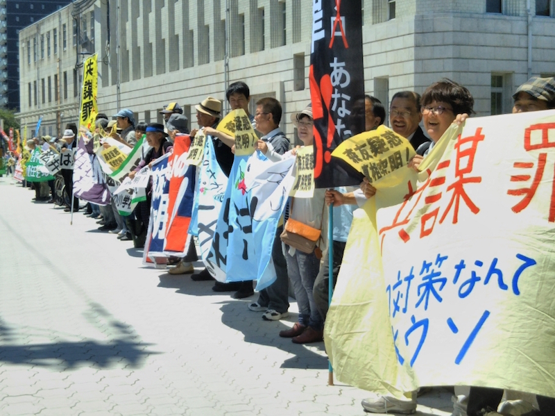 まさに初夏の暑さの昼間に250名もが大阪府下各地から府庁前に集まり、松井知事へ戦争国家づくりに加担するな!と責任追及の声を上げました。