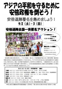 核兵器禁止条約の参加を拒否し、トランプ政権と一緒になって朝鮮脅威を声高に叫び、戦争法発動・集団的自衛権行使をねらう危険な安倍政権を許してはなりません。アジアの平和を守るためには安倍政権を今すぐ退陣させるしかありません。森友・加計問題で私腹を肥やした側がさらに特権をもち、一切真実を明らかにしないまま戦争にひたすら向かう安倍政権への怒りを形にし、9月末の臨時国会開始時に全国から安倍退陣署名(5万筆目標・12/18まで8万筆目標)を突き付けましょう!